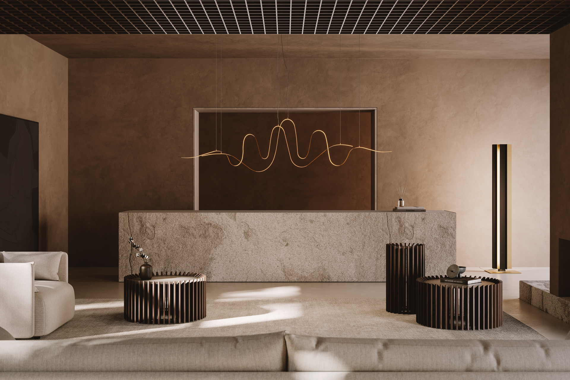 The intangibility of light converses with the materiality of metal. Bissa Suspension is a lamp that is characterized by an evocative délabré burnished brass structure supported by adjustable steel cables. A Strip LED runs through the sinuous curves generating a trail of light that seems to be suspended in space.