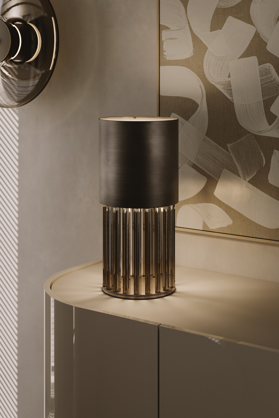Chic Table’s sculptural design propagates luminous alchemies. The Murano glass trihedrons, available in three colors, gives rise to rays of light that trace radial geometries on the surrounding surfaces. The lampshade and base, made of light striped bronze, add intensity to the lightness of the glass. Chic is also available in a floor version.