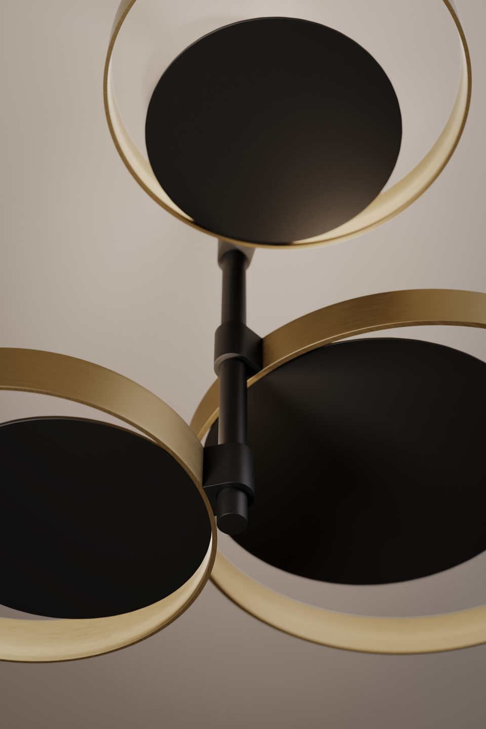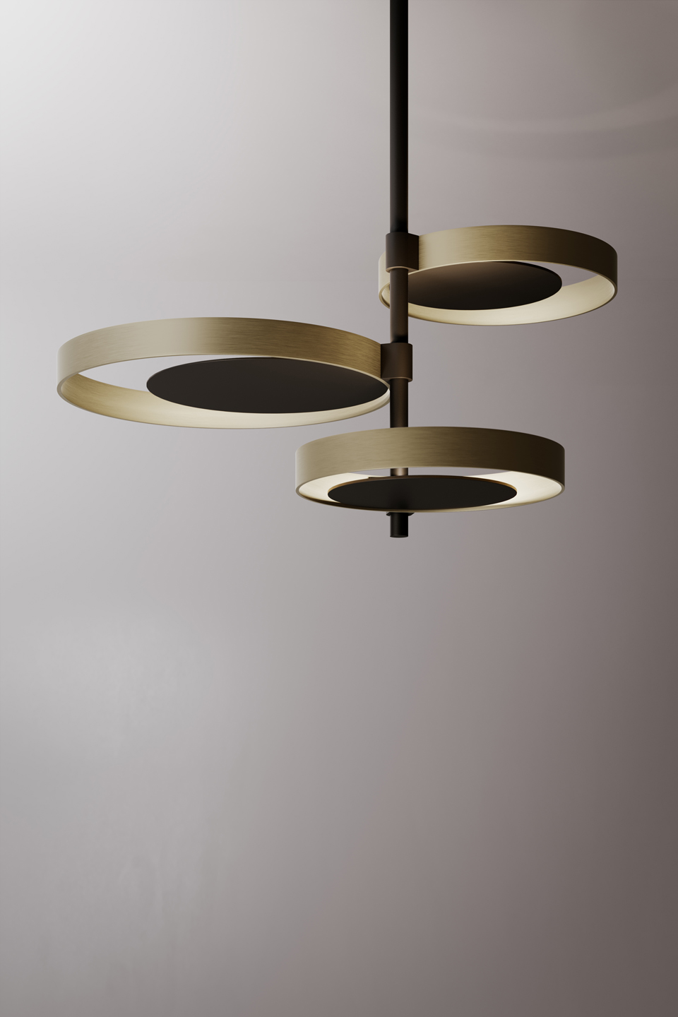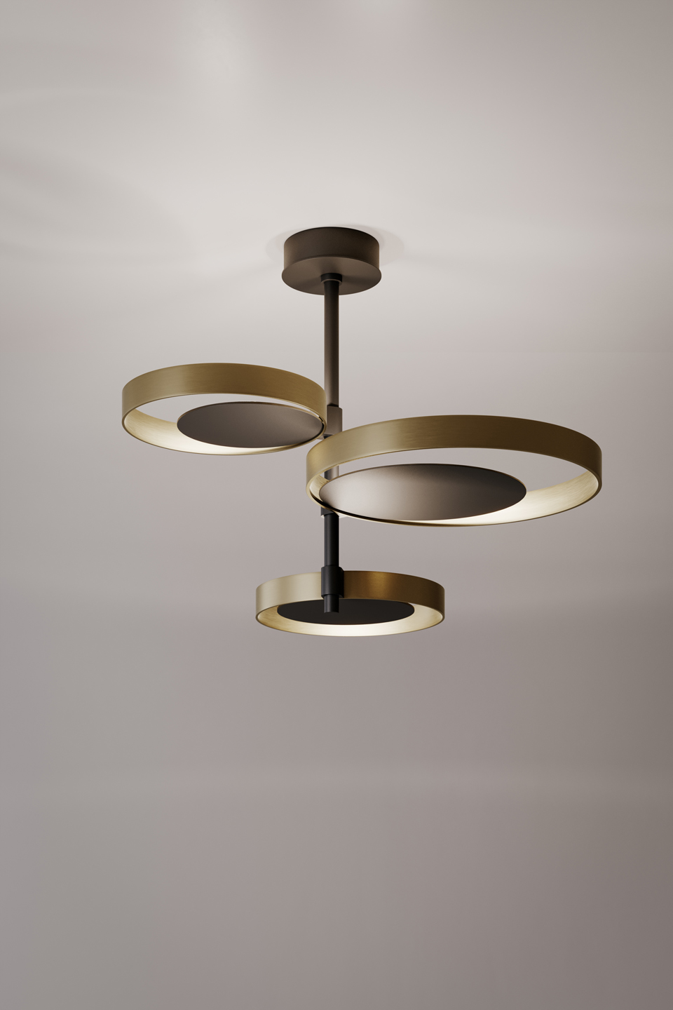 Circle Ceiling is based on a simple circle shape. Three light sources, which are supported by a central rod, come to life in a dynamic composition. Indirect light is diffused across the surrounding space, bouncing from light burnished brass rings, which encircle matte black nickel discs. Circle is also available in a wall version.