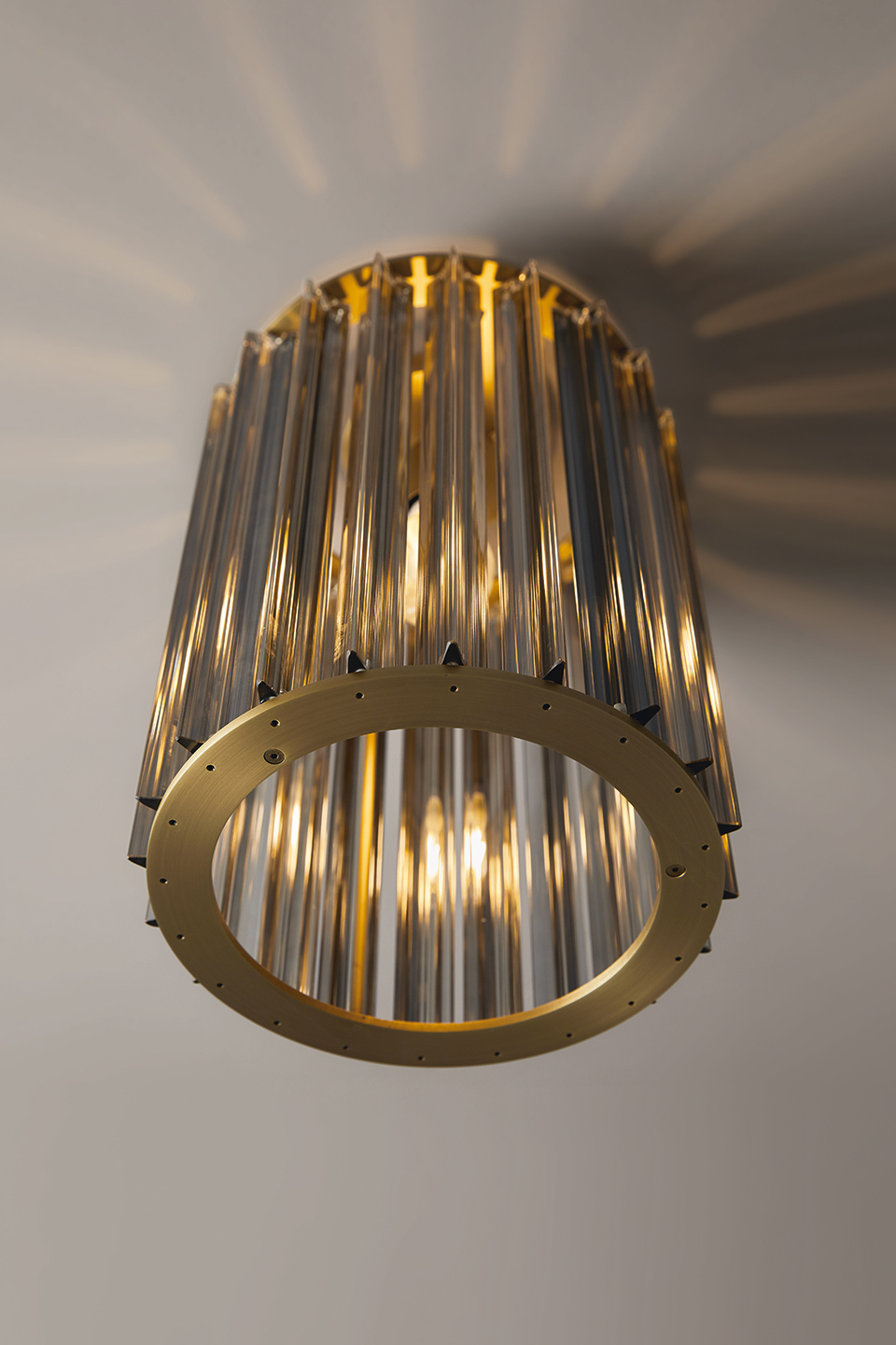 Murano glass trihedrons diffuse light throughout the surrounding space, forming linear reflections on the ceiling. Crown Ceiling’s luminous sculptured form consists of a burnished brass or matte black nickel structure, which frames its trihedrons, highlighting their luster. Light is diffused through glass that comes in a choice of crystal, amber, or smoke grey. Crown is also available in wall and suspension versions.