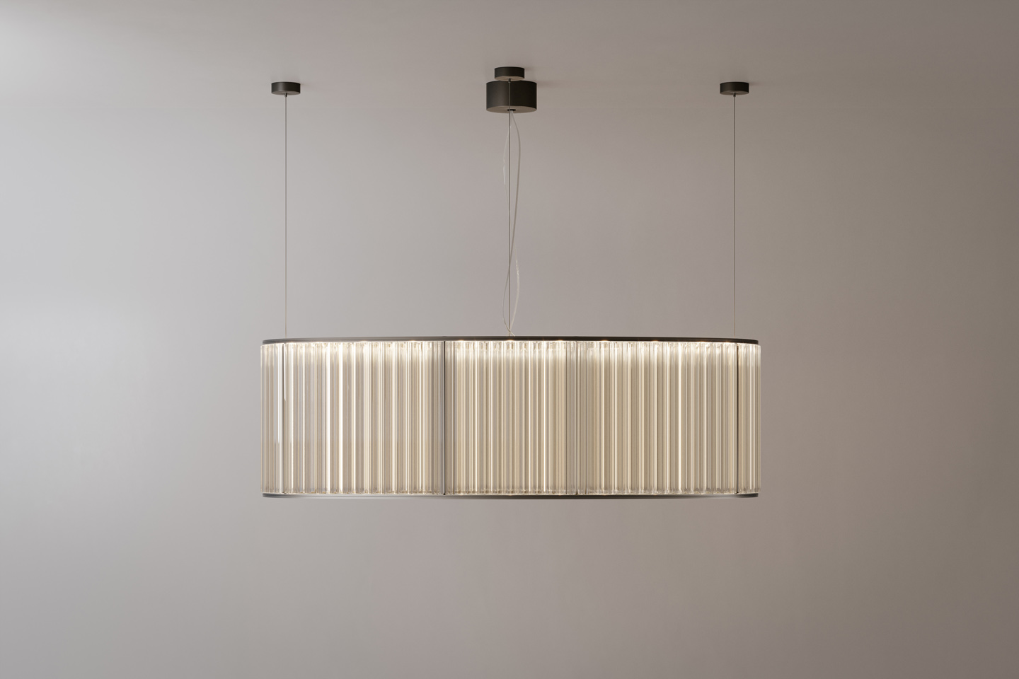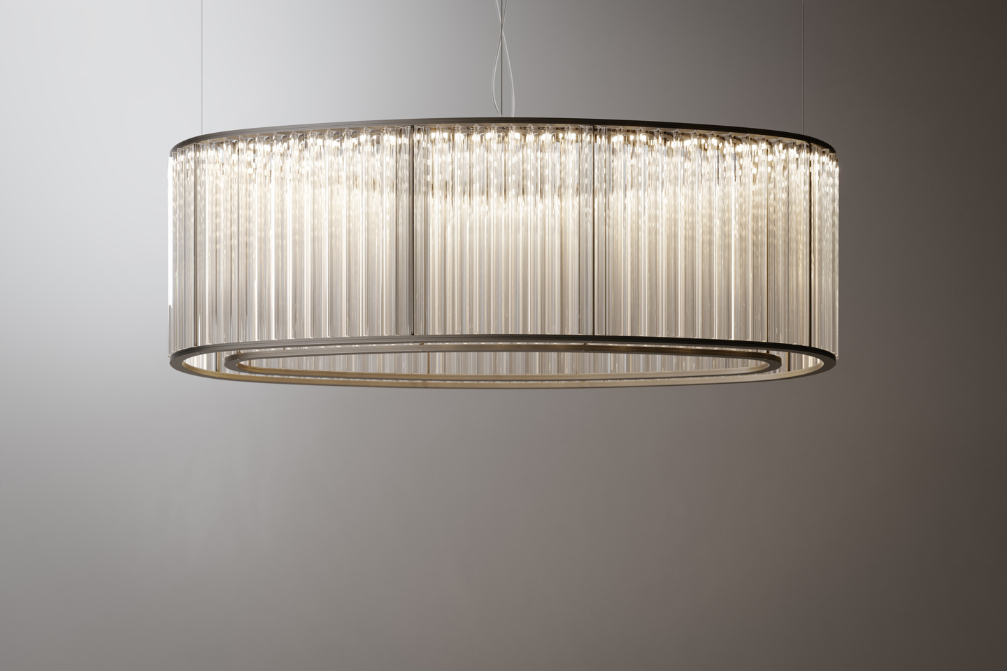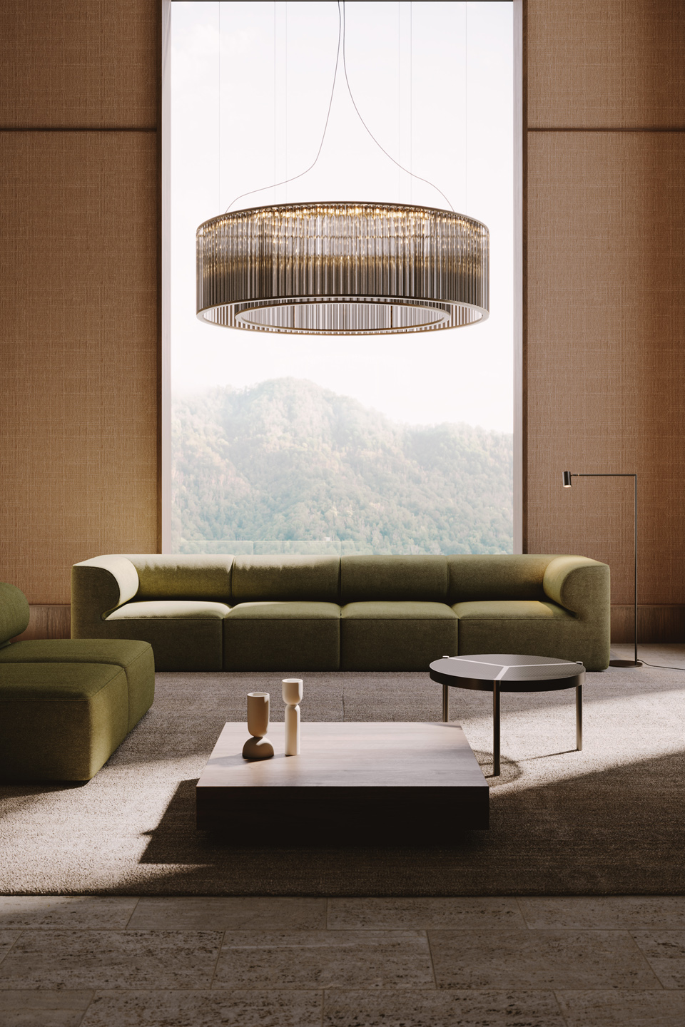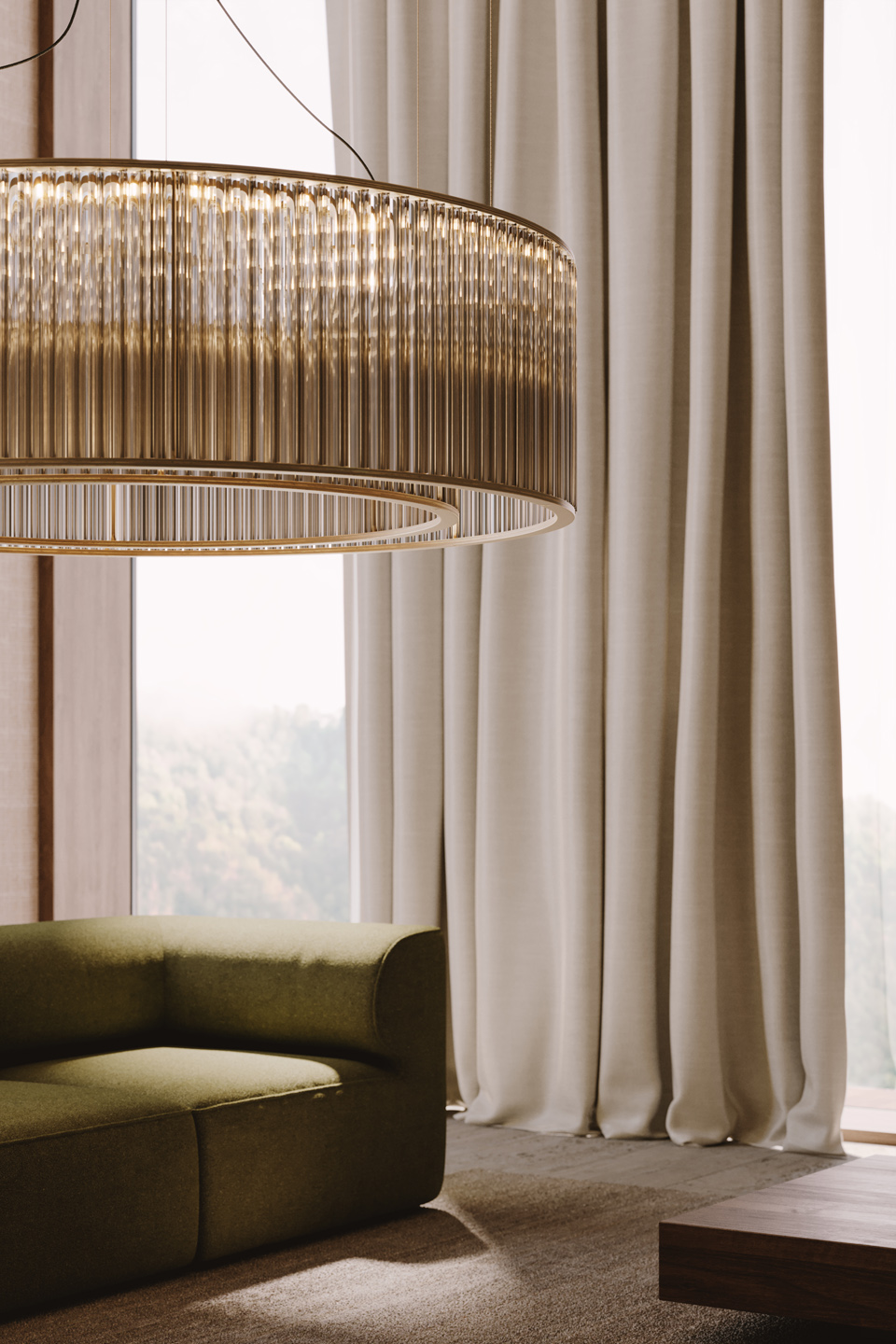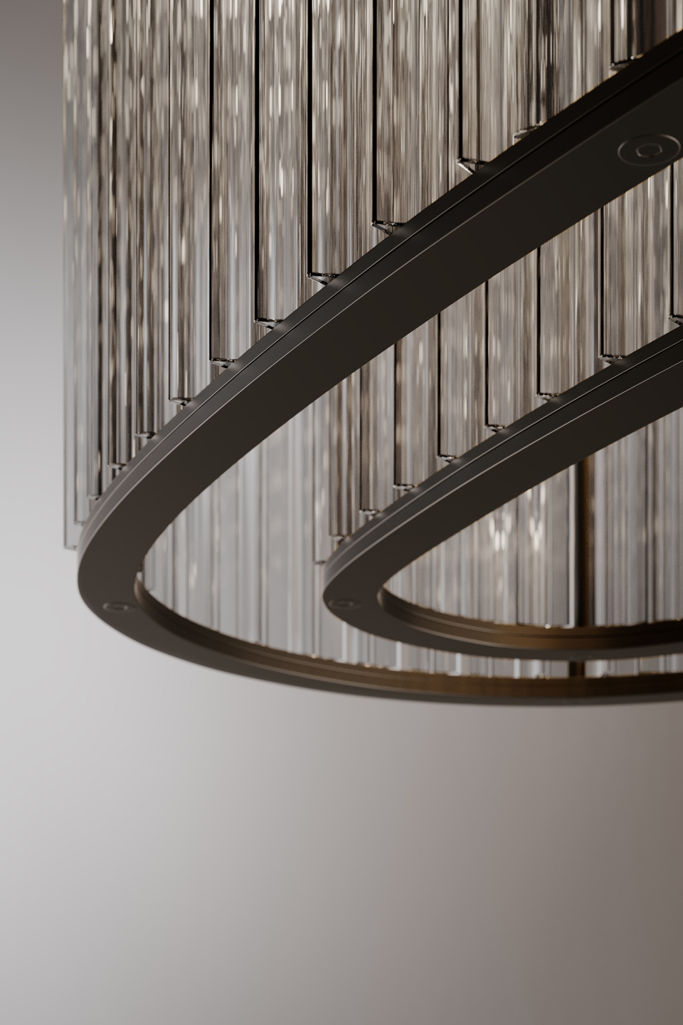 Crown Suspension’s imposing luminous sculptured form shapes the light, creating evocative reflections in the surrounding space. The luster of its amber or smoke grey Murano crystal glass trihedrons is enhanced by its burnished brass or matte black nickel metal structure. Crown is also available in ceiling and wall versions.