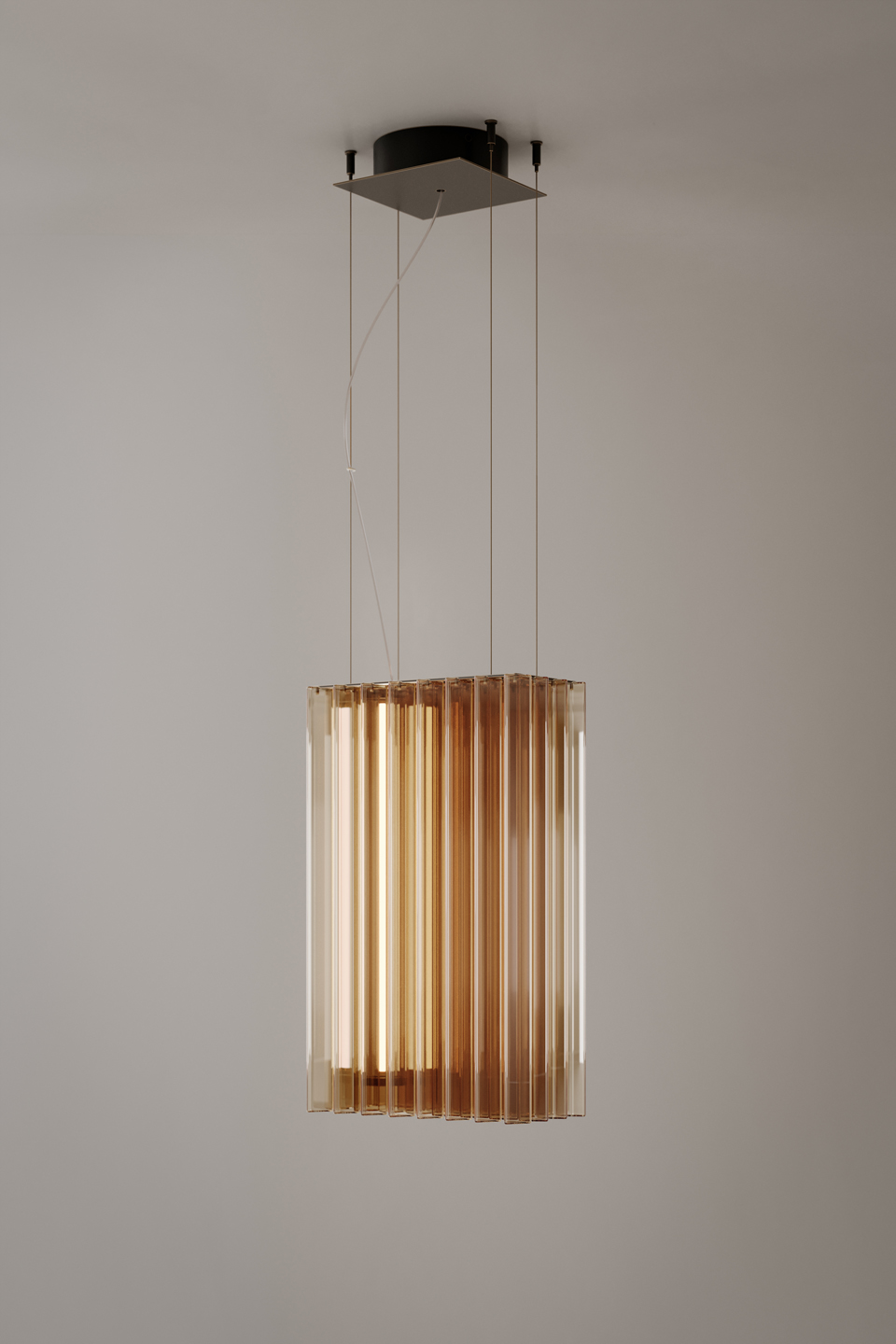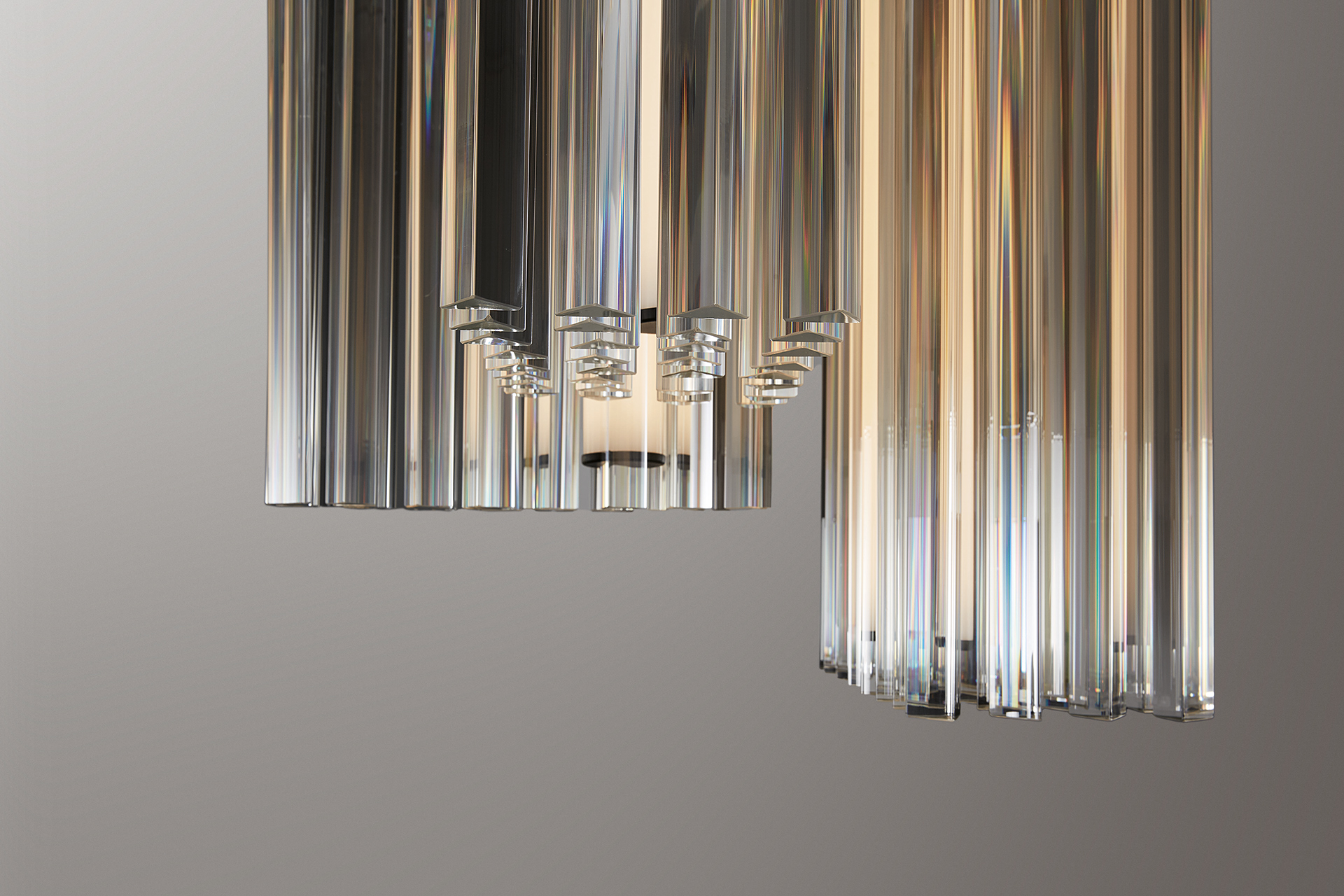 The Grace Suspension lamp looks like a material fragment floating in space. Crystal, amber, or smoke colored Murano blown glass trihedrons shape the light generated by the LEDs, which are positioned in a central cylindrical body, propagating it within the surrounding space. Formal rigor and elegance meet in a suspended structure where the lightness of the glass acquires an intense expressive charge.