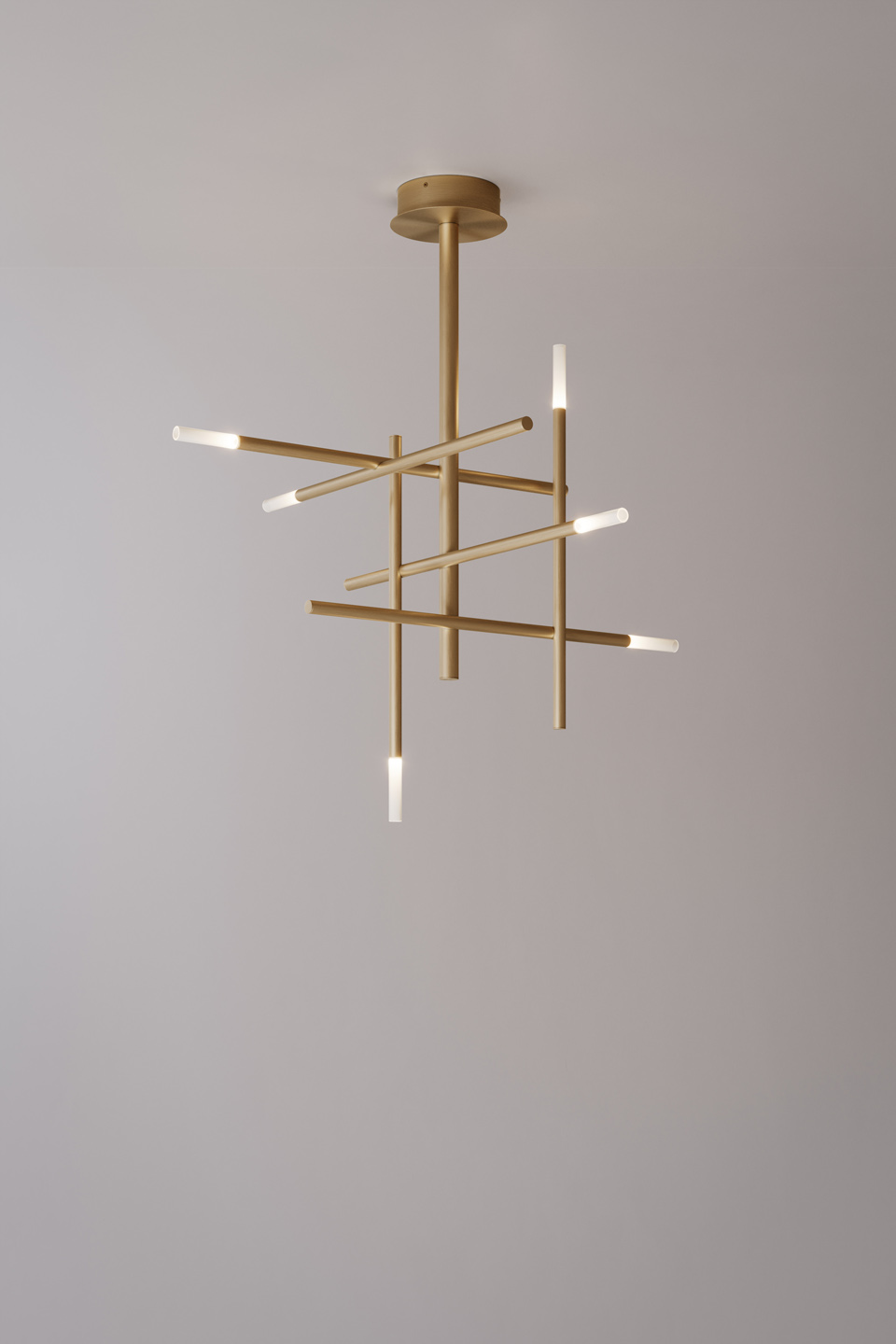 The Kitami Suspension lamp is based on purely geometric elements. Solid intersecting bars define its structure, which is available in four finishes: polished or matte black nickel, light burnished brass or polished gold. At the ends of the rods, discreet satin glass light sources reveal light in its most essential form. Also available in a wall version.