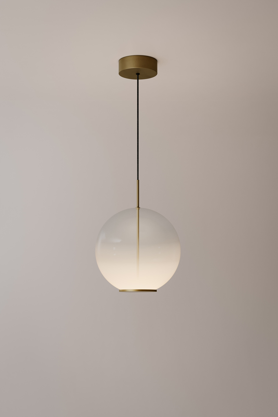 Delicate spheres seem to float weightlessly in the air, supported by a discreet burnished natural brass structure. The primary shape of the blown white glass lampshades creates an effect of lightness and calm, through this purist interpretation of light. Expert craftsmanship highlights materials that become incorporeal, while its luminosity is diffused gently throughout the surrounding space. Available in three sizes, the spheres broaden one’s compositional possibilities. Misty is also available in a table version.