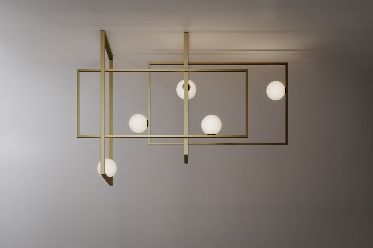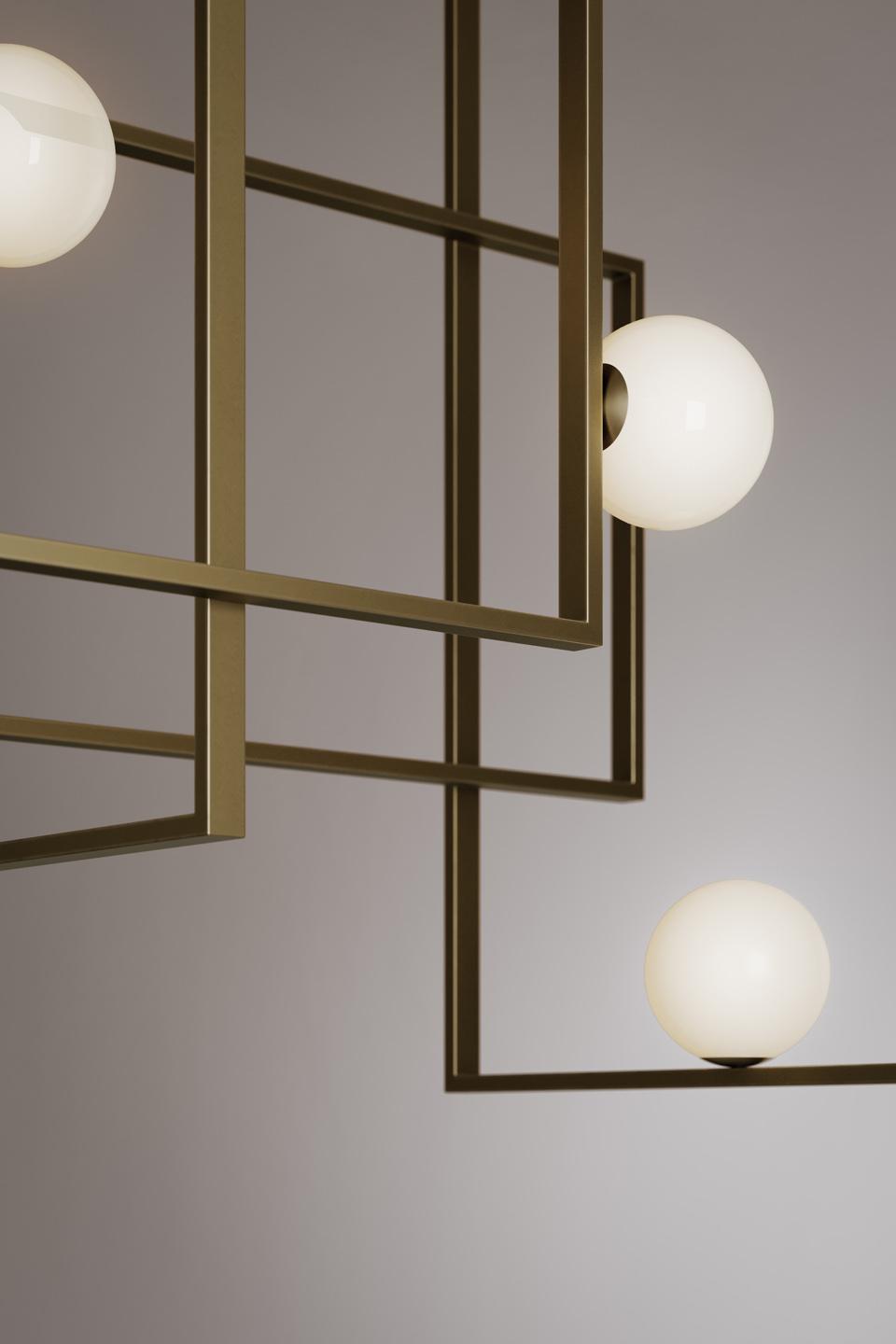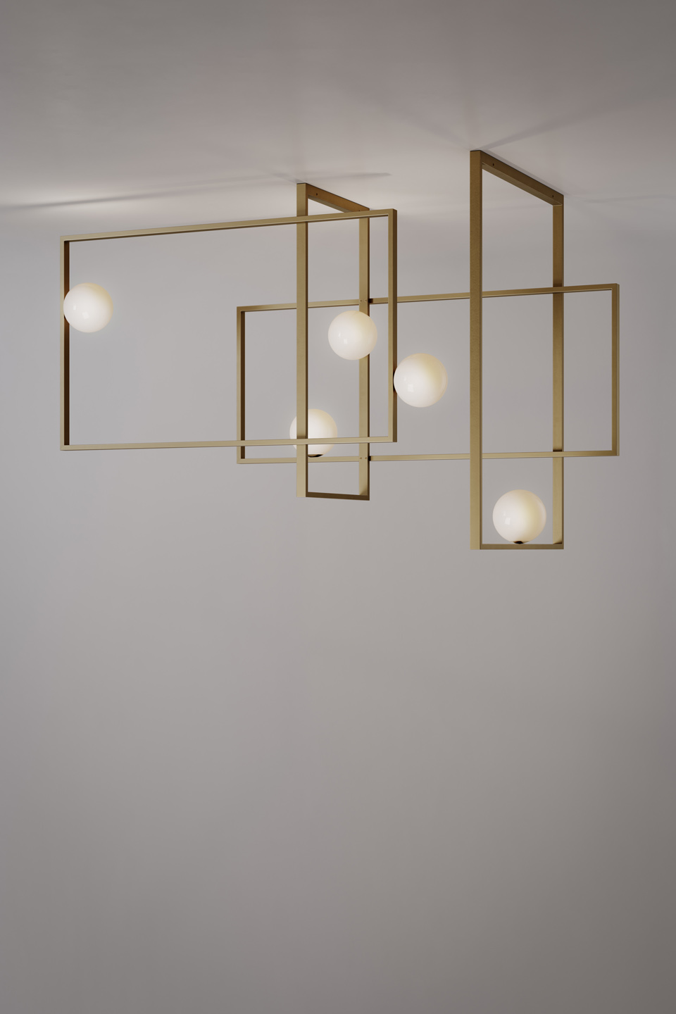 Mondrian Glass Ceiling interprets pure design that combines geometric shapes in light sculptures. Bright white Murano glass spheres soften the rigorous lines of intersecting rectangles. The structure, which is available in polished or matte black nickel, burnished natural brass or polished gold, is lit up with reflections of light, which are diffused into the surrounding space. Also available in floor and wall versions.