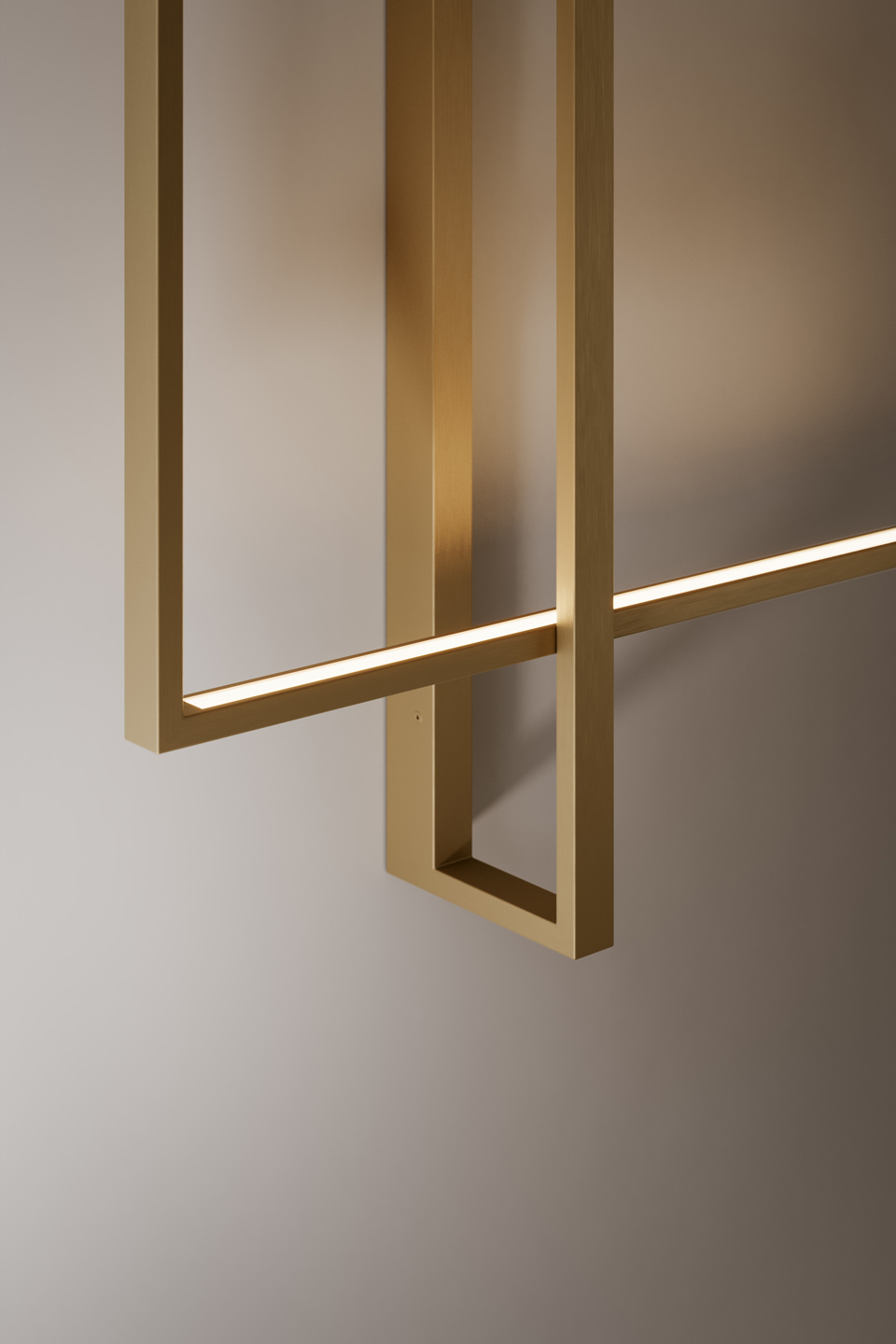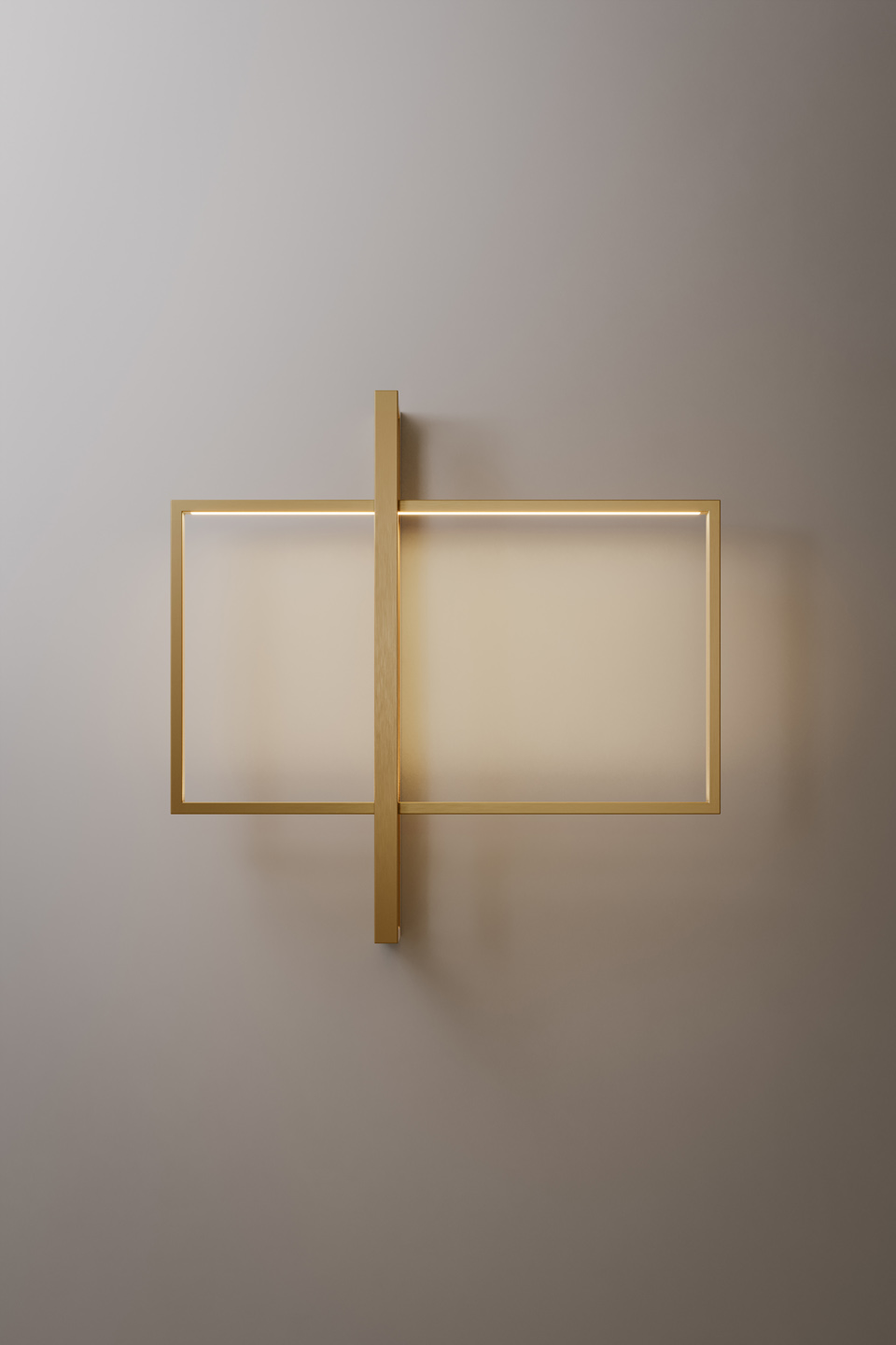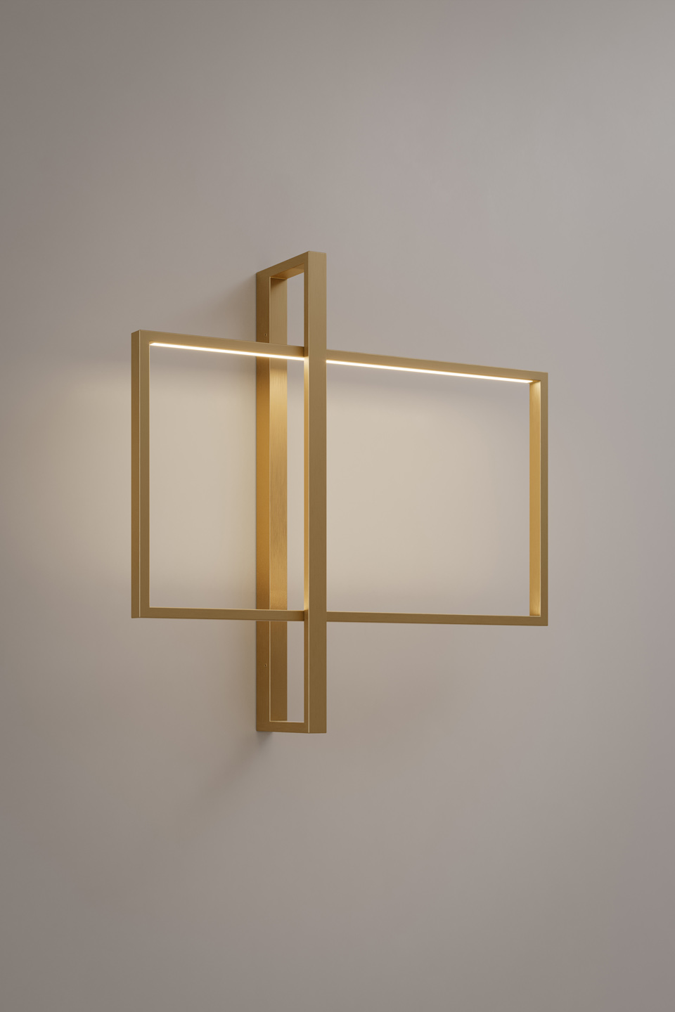 A solid rectangular shape is reinterpreted in the elegant lines of the Mondrian LED Wall light. Two primary figures converge, outlining precise geometric intersections that diffuse indirect light from LEDs that are integrated into its structure. Available in matte black nickel, polished gold, or light burnished brass finishes. The Mondrian LED is also available in a ceiling version.
