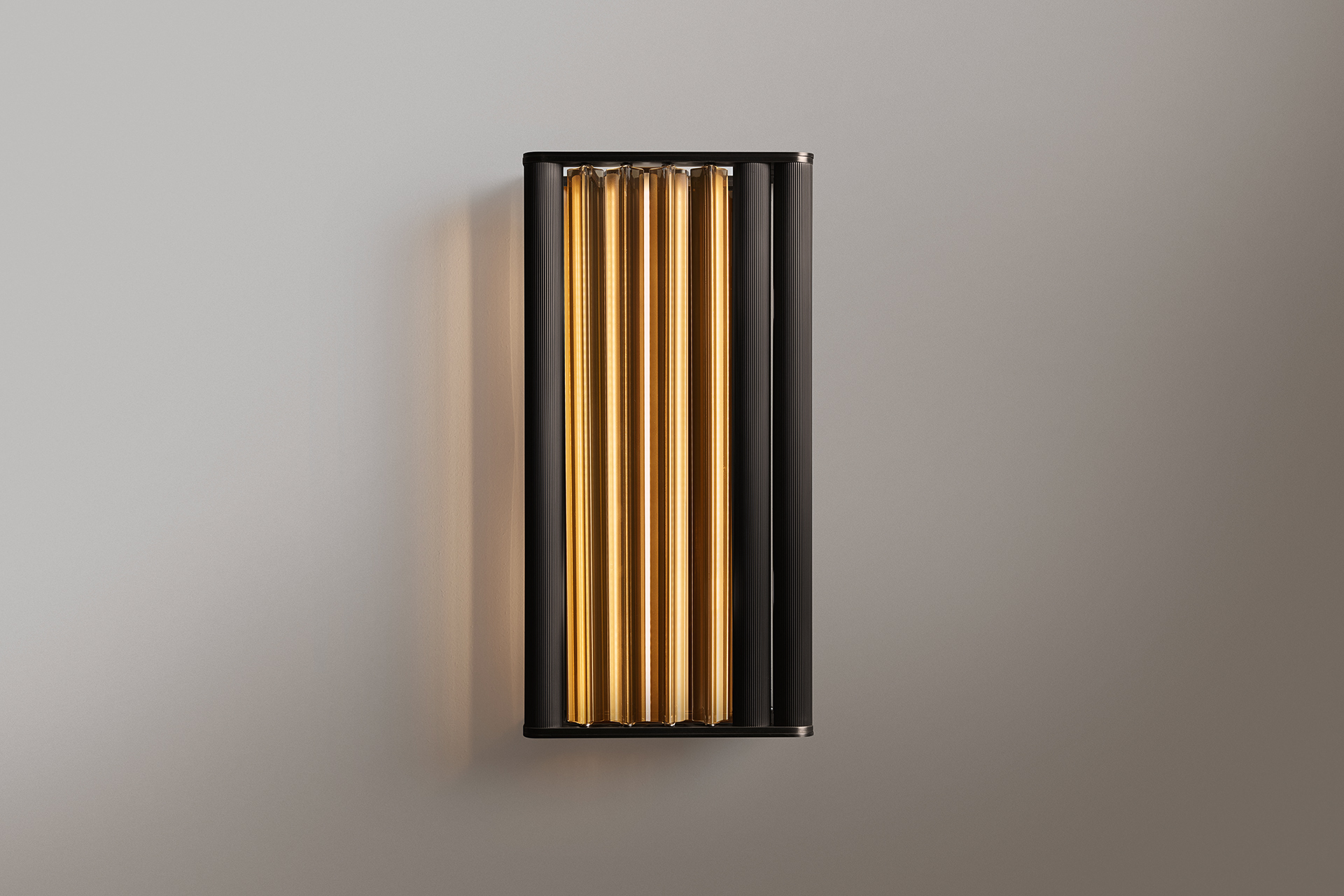 The evocative lines of the Numa Wall lamp draw inspiration from ancient architectural elements; evoking the sculptural features of a column, it diffuses light into the surrounding space. Its dark burnished brass structure frames crystal, amber, or smoke grey Murano glass trihedrons. Numa is also available in floor and suspension versions.