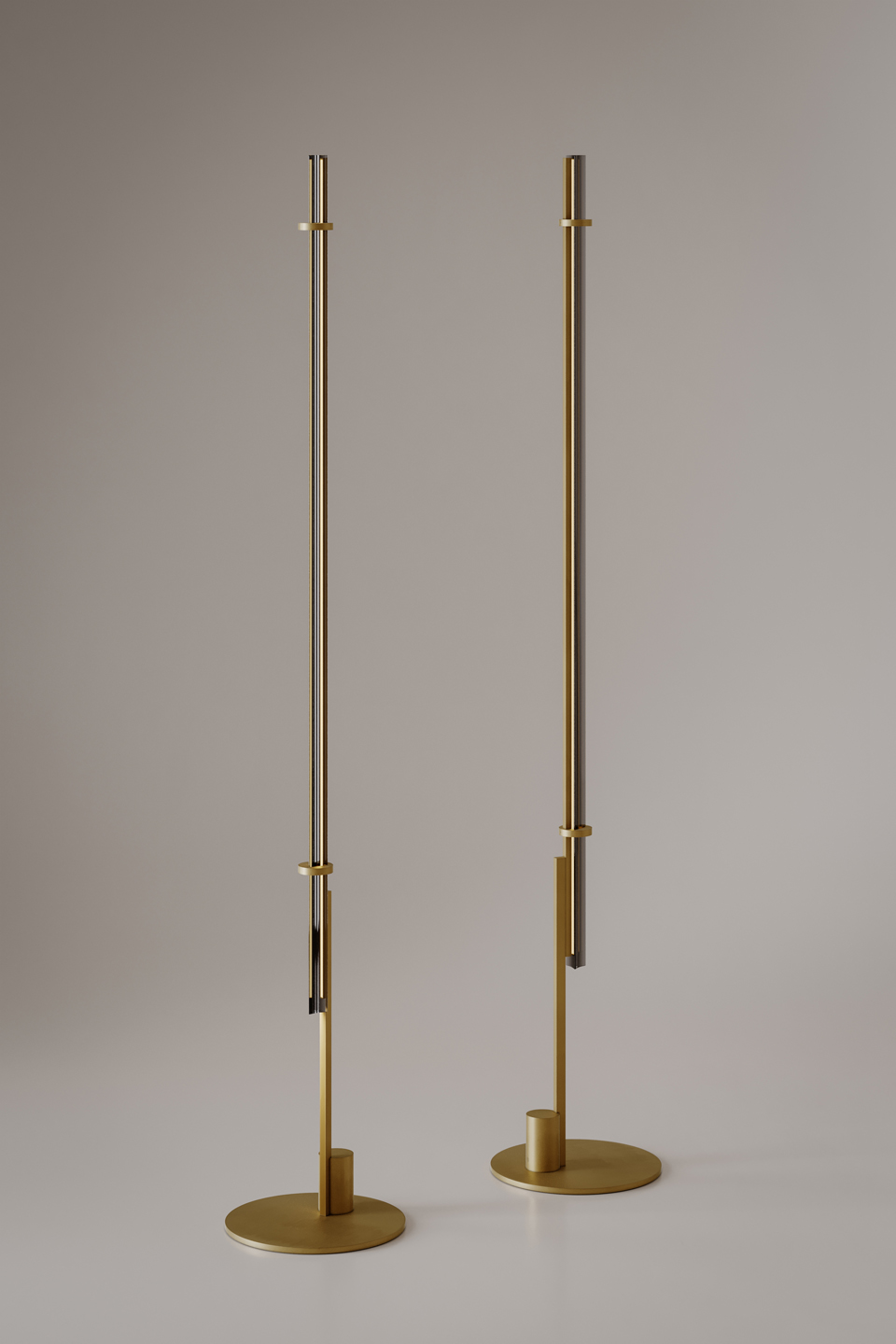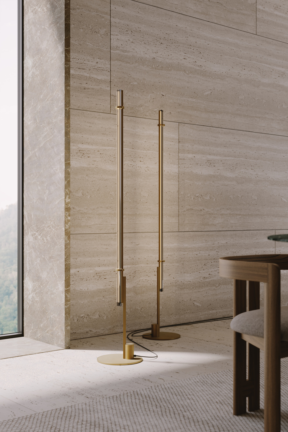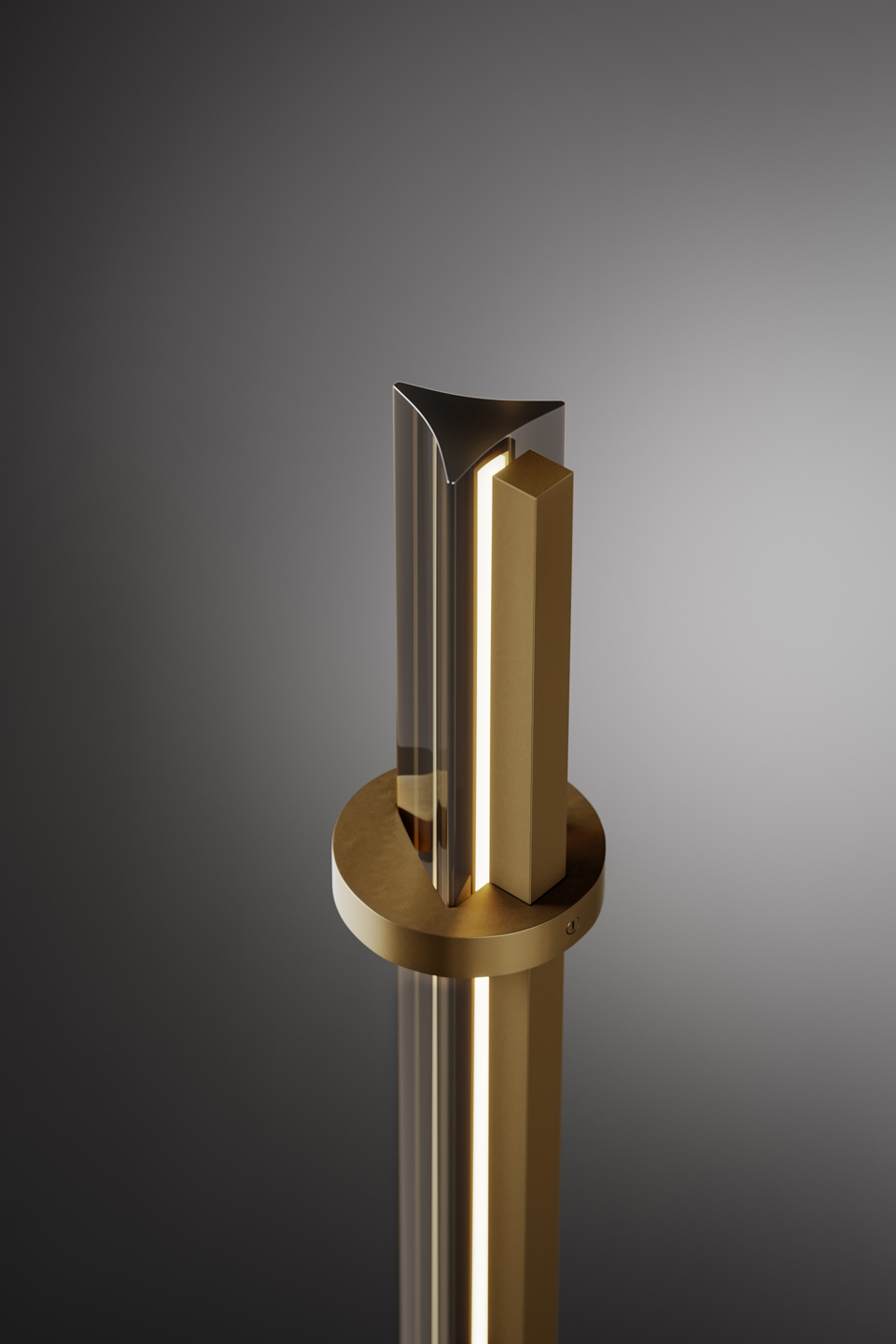The evocative lines of the Numa Wall lamp draw inspiration from ancient architectural elements; evoking the sculptural features of a column, it diffuses light into the surrounding space. Its dark burnished brass structure frames crystal, amber, or smoke grey Murano glass trihedrons. Numa is also available in floor and suspension versions.