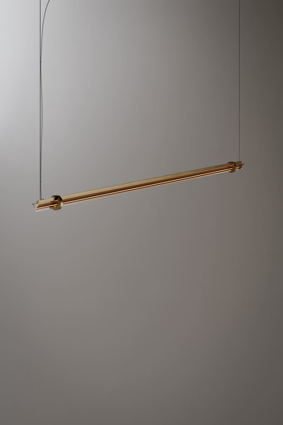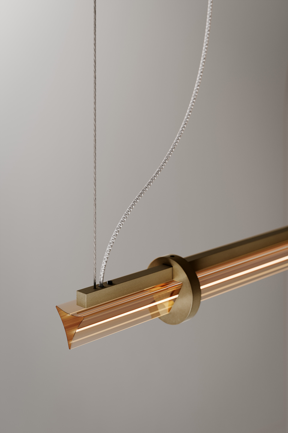 Optical Suspension 1 is characterized by a burnished natural brass structure that supports the glass trihedron, available in amber, smoke grey or crystal colors, which floats lightly in the environment. The light source passes through the Murano glass diffuser, radiating a soft and linear light. The Optical collection is available also in wall, floor, table and suspension versions, with one or three elements.