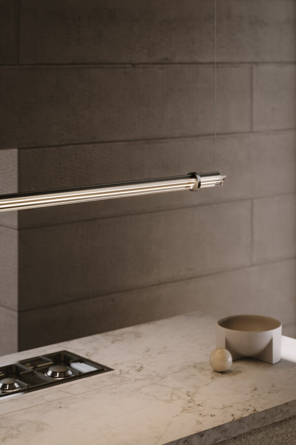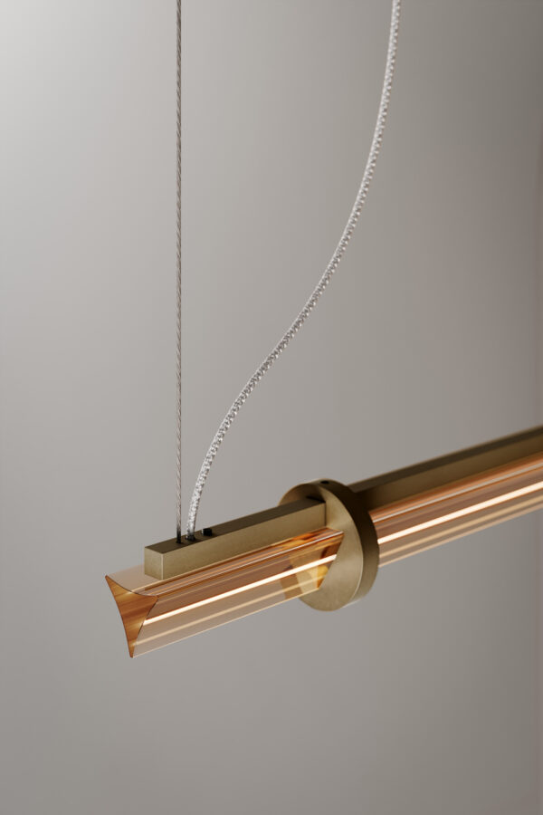 Optical Suspension 1 is characterized by a burnished natural brass structure that supports the glass trihedron, available in amber, smoke grey or crystal colors, which floats lightly in the environment. The light source passes through the Murano glass diffuser, radiating a soft and linear light. The Optical collection is available also in wall, floor, table and suspension versions, with one or three elements.