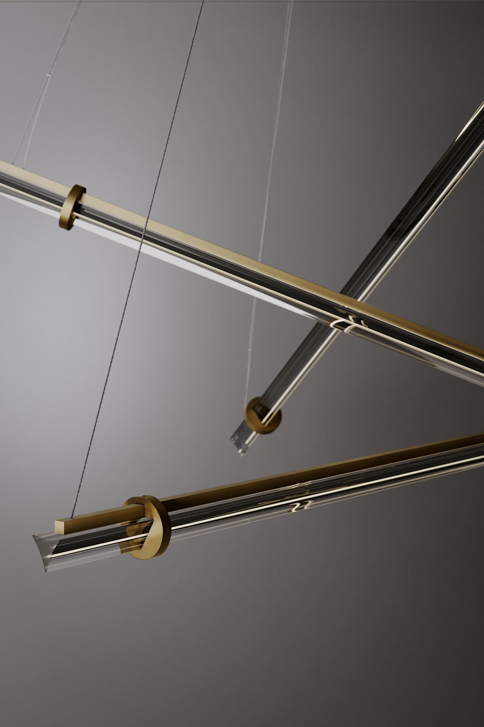 Optical Suspension 3 features a burnished natural brass structure that supports three glass trihedrons, available in amber, smoke grey or crystal, creating a suspended and lightweight composition. The light source passes through the Murano glass diffusers, radiating a soft light into the environment. The Optical collection is also available in floor, table, wall and suspension versions, with one element.