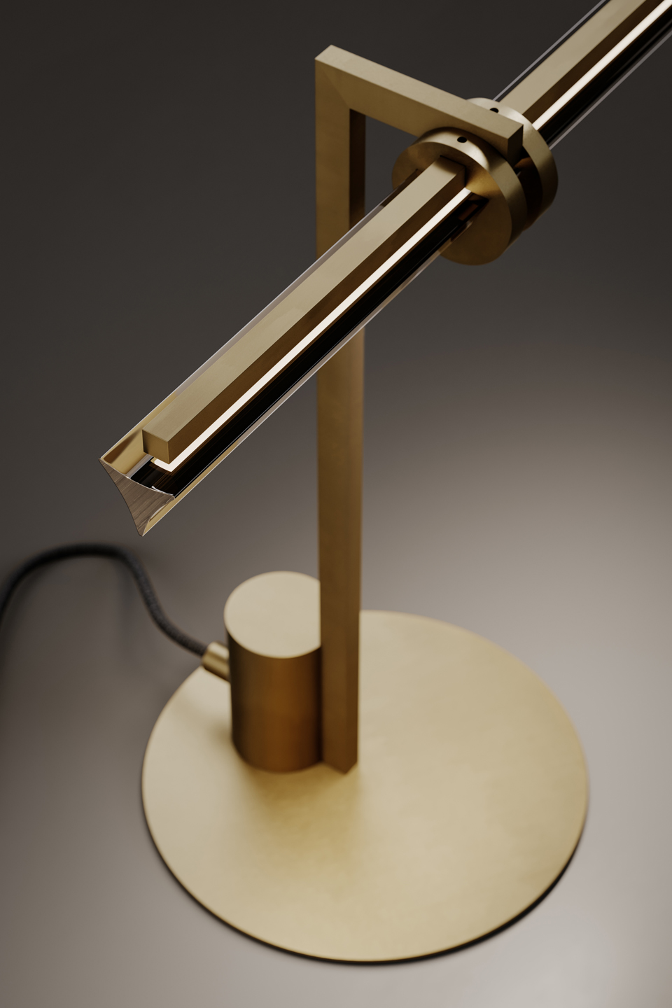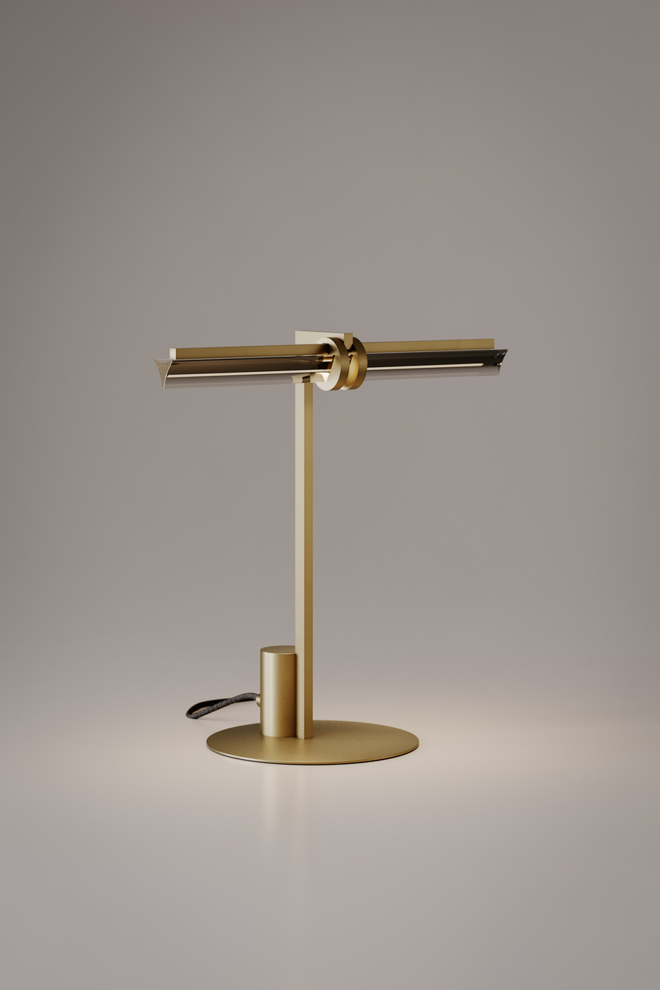 Optical Table enhances the combination of primary forms and noble materials with Murano glass trihedrons. The burnished natural brass structure supports the glass trihedron, available in amber, smoke grey or crystal. The light source passes through the glass diffuser, radiating a soft light onto surrounding surfaces. The Optical collection is also available in floor, wall and suspension versions, with one or three elements.