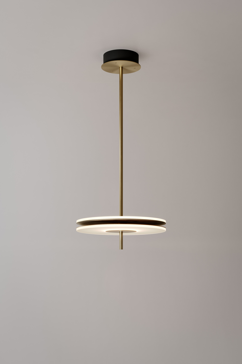 Two discs of light supported by a discreet central rod float incorporeally in the surrounding space. The Soul Suspension lamp filters a dense glow, through the soft and enveloping materials, from which the two superimposed satin glass and metal diffusers are made. The light burnished brass or matte black central stem reinforces the delicate and suspended presence of light.