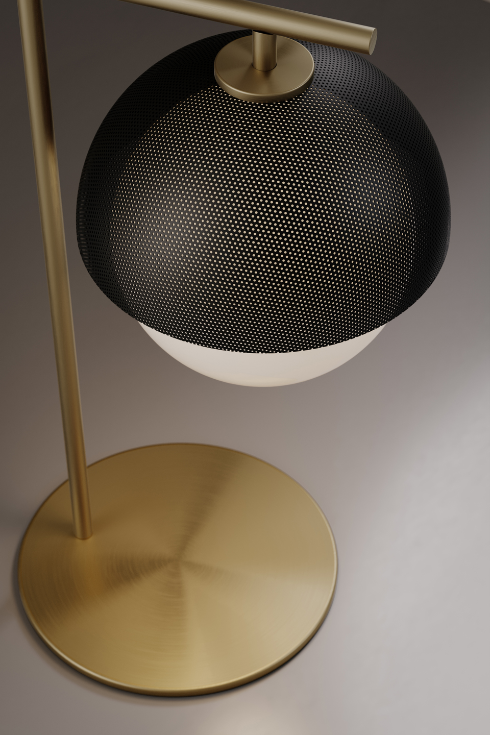 The light which filters through micro-holes defines the contours of its delicate structure, creating an atmosphere of harmony and stillness. Urban Table’s light or dark burnished brass base is composed of a vertical rod that supports the light source. A matte black or gold micro-perforated metal lampshade shields the warm and welcoming light of the Murano blown glass diffuser. Urban is available in suspension, floor, and wall versions.